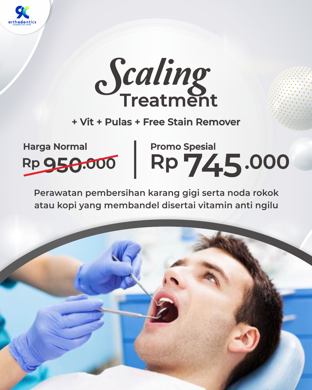 Scaling + Stain Remover adalah pembersihan karang gigi, + pulas, + vitamin anti ngilu dengan formula penghilang STAIN (Noda bekas rokok/kopi/teh) Dengan Scaling ini, maka gigi Kamu makin KINCLONG dan senyum semakin SUMRINGAH tentunya. So, Yuk Segera Reservasi ya kak. Mincy Tunggu.
